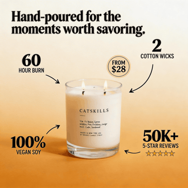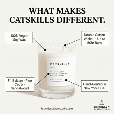 📊 Specs kill skepticism 60 hours. Two wicks. Fir balsam, pine, cedar, sandalwood. Vegan soy. Hand-poured in New York. Specificity turns a pretty candle into a considered purchase.